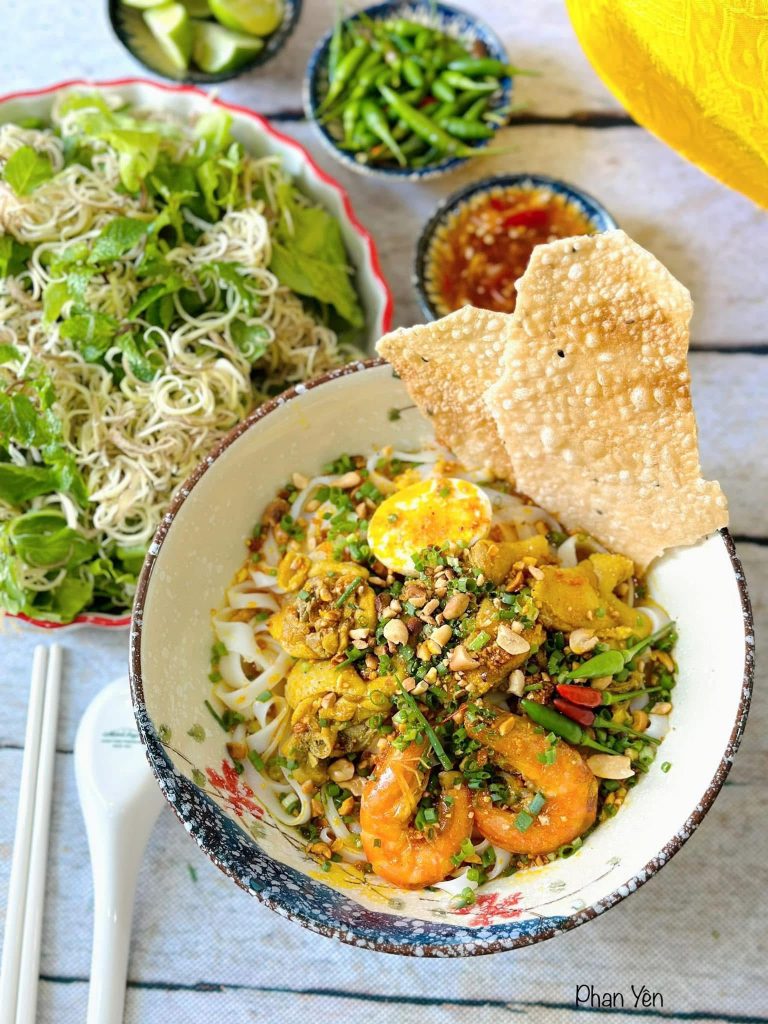 Mì Quảng được xem là “quốc hồn quốc túy” của người Quảng Nam. Sợi mì vàng óng, mềm nhưng không bở, ăn cùng nước dùng sền sệt từ tôm, thịt, gà hoặc cá lóc. Thêm đậu phộng rang, rau sống Trà Quế, bánh tráng nướng và ớt xanh cay nồng, tô mì Quảng trở thành bữa ăn hội tụ đủ vị ngọt – bùi – béo – cay.